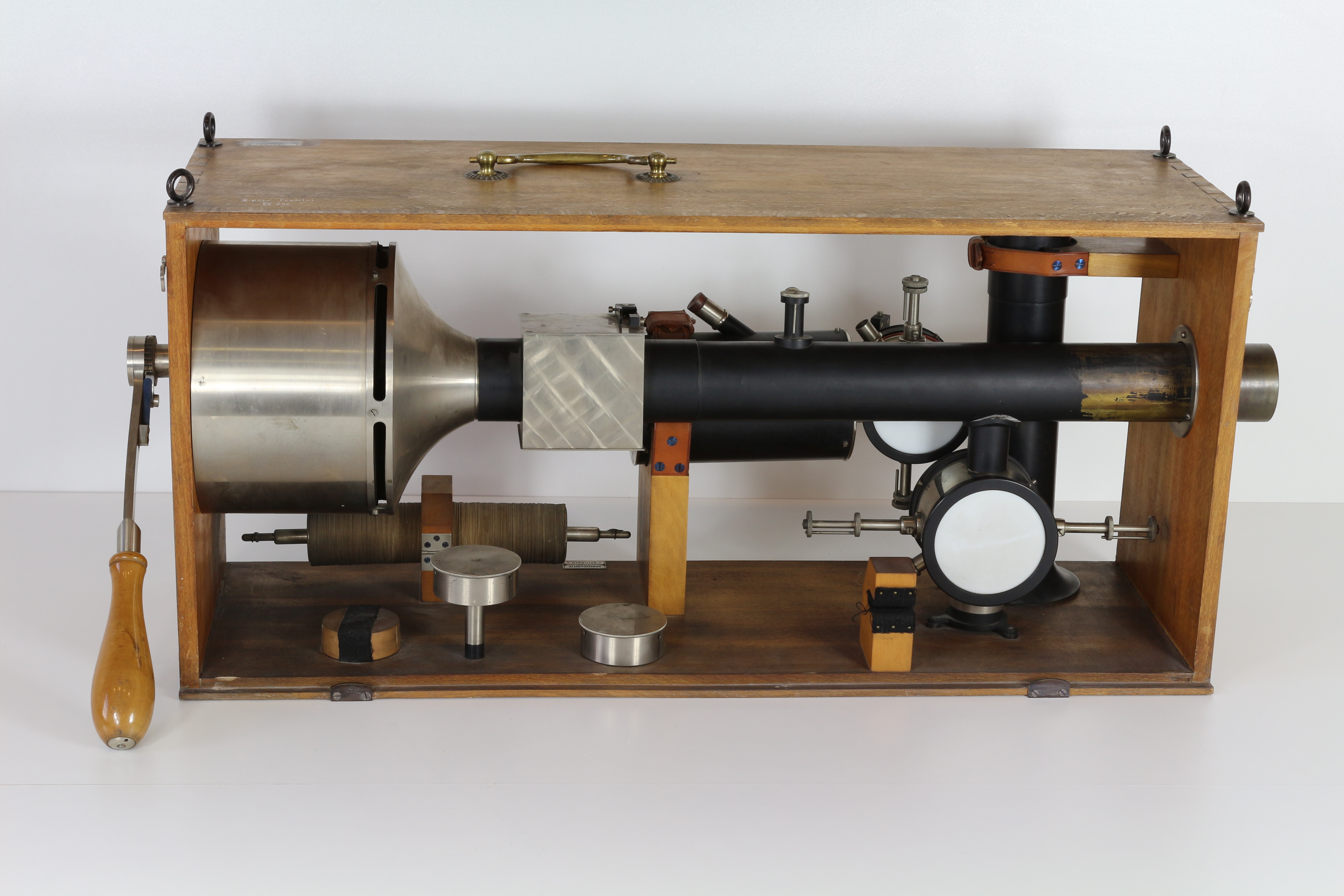 Dieser Apparat besteht aus zwei Elektroskopen, zwei Zylinderkondensatoren, Zambonisäule, Sauggebläse mit Zählwerk und Kurbel. Das vertikale schwarze Rohr mit Elektroskop und verstellbarem Zylinderkondensator ist für den Betrieb aus der Kiste zu... mehr anzeigen